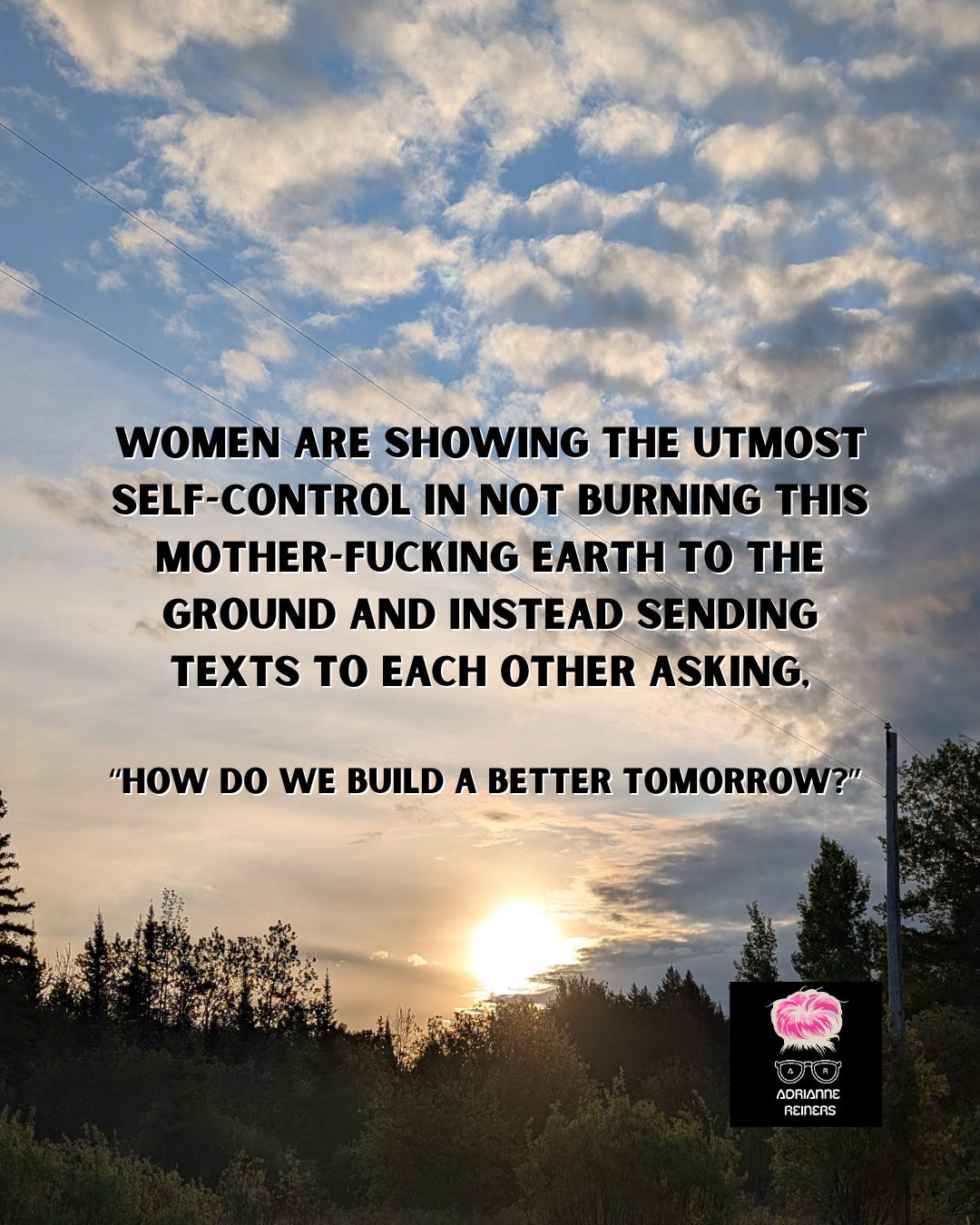 Women are showing the utmost self-control in not burning this mother-fucking earth to the ground and instead sending texts to each other asking, “how do we build a better tomorrow?”