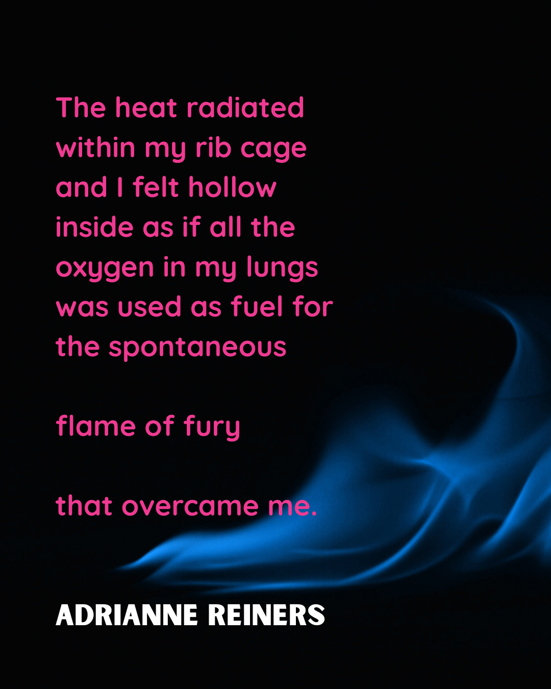 Still, that flame of fury is emanating heat above my liver, behind my lungs, between my heart and stomach in such a robust way it wouldn’t matter how much oxygen I inhaled. This fury demands more oxygen and seems born from an endless supply of methane for continuous combustion.